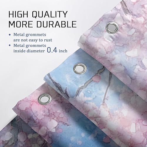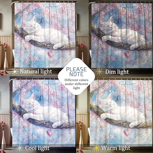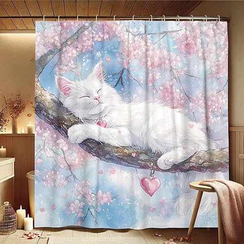 Rideau de douche motif chat mignon blanc avec branches de cerisier - Décoration de salle de bain - Printemps été - Tissu imperméable - Avec crochets - 183 x 198 cm