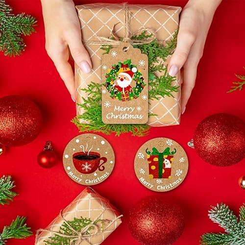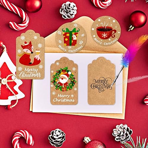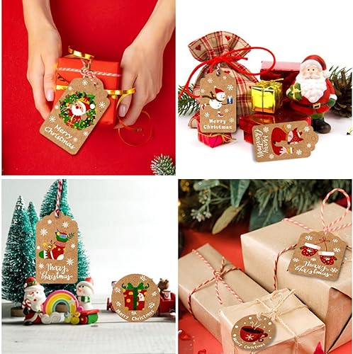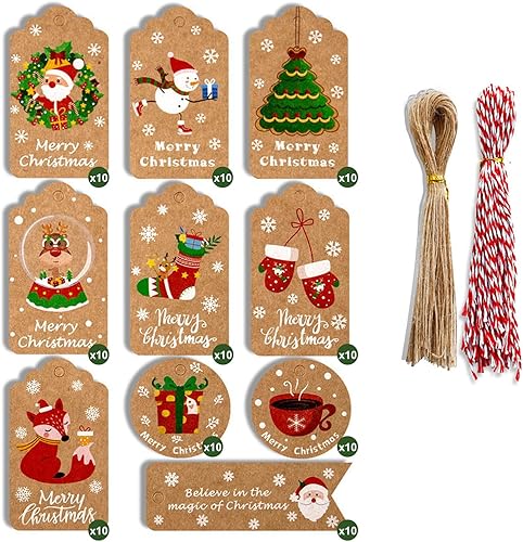 100 Pièces Étiquettes de Noël en Papier Kraft Brun Avec Ficelle, Tampon et Étiquette pour Emballage Cadeaux de Noël, 10 Modèles pour Décoration (Style A)