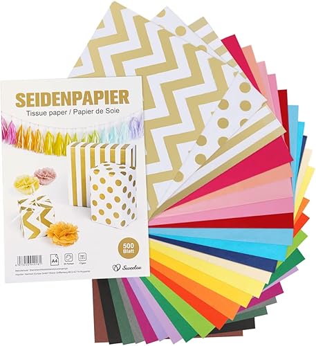 Sweelov Lot de 500 feuilles de papier de soie, transparentes, colorées, 25 couleurs, format A4, pour emballer des pompons, décoration de table, DIY, 16 g/m²