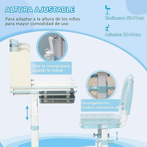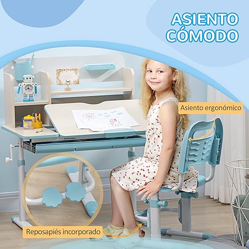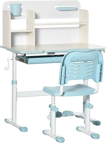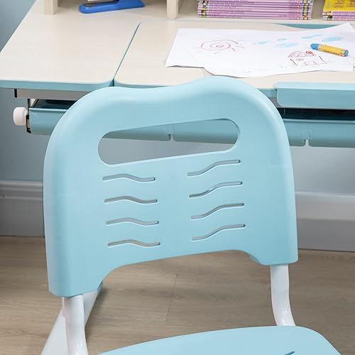 Homcom Bureau et chaise pour enfant de plus de 3 ans avec bureau réglable en hauteur avec plateau de table inclinable, tiroir et étagère à livres 80 x 52 x 88-109 cm et 35,5 x 44,5 x 66-80 cm, bleu
