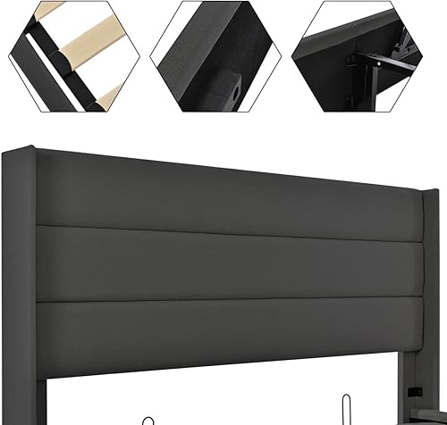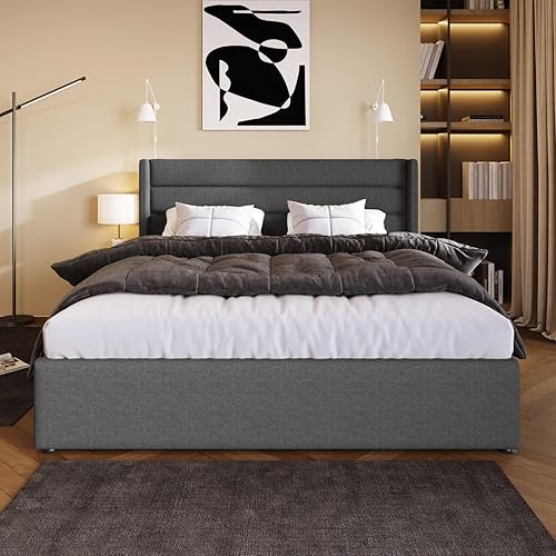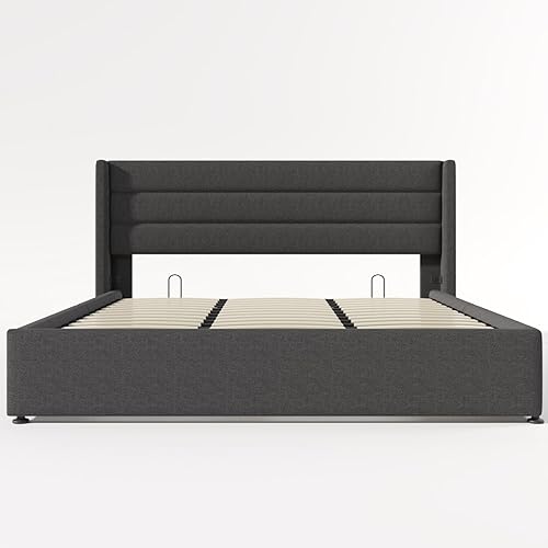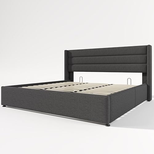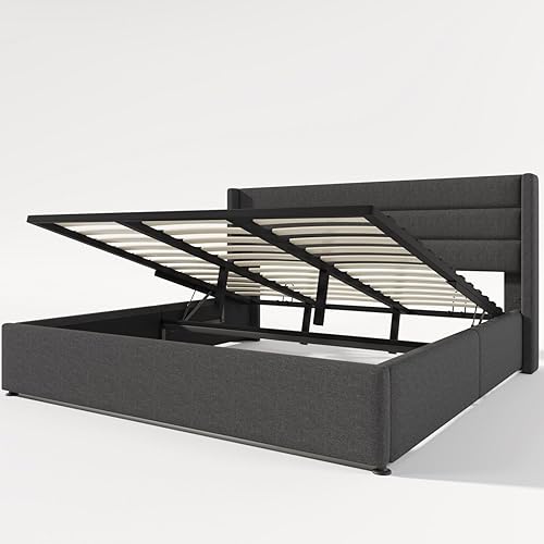 Sweiko Lit capitonné, 180 x 200 cm, hydraulique, avec sommier à lattes hydraulique, unique, avec espace de rangement, lit fonctionnel, cadre de lit avec cadre en métal, beige (sans matelas)