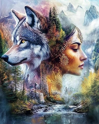 AYAOYANGGO 9CT Diy Kits De Point De Croix De Perles Loup Animal Et Femmeensemble De Bricolage Avec Perles,Kit De Peinture De Perles Fait À La Main De Needlework Handcraft Needle Arts Decor 40x50cm