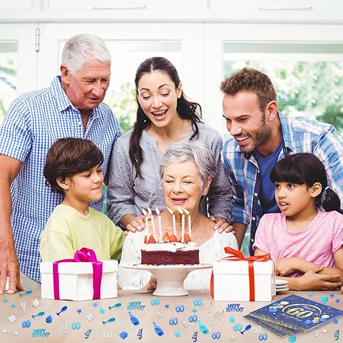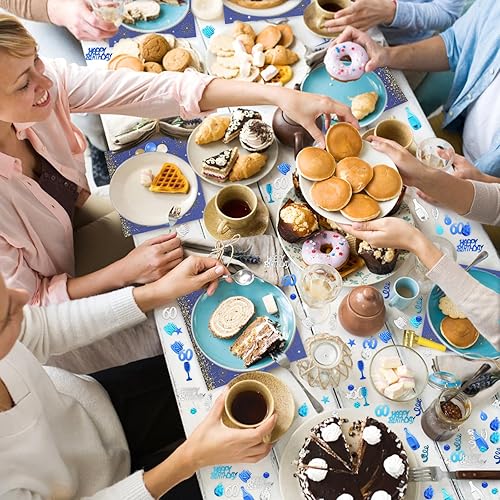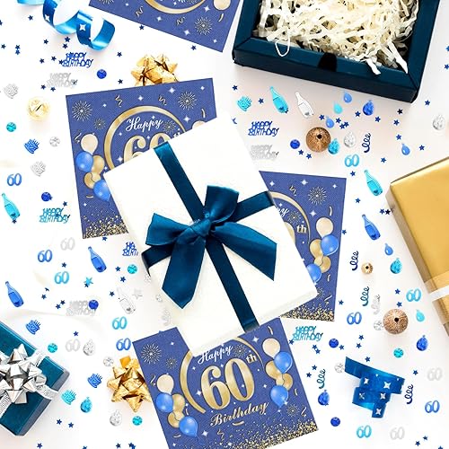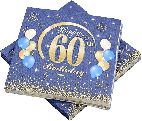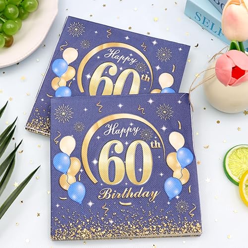 KASURE Lot de 50 serviettes décoratives pour 60e anniversaire garçon avec confettis Happy Birthday, 33 x 33 cm, 60 serviettes de décoration pour fête d'anniversaire, bleu et doré, 60 ans, filles et