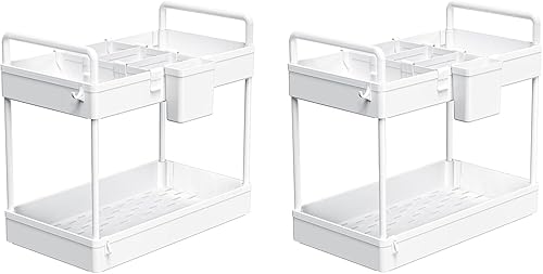Ronlap Paquet de 2 d'organisateur d'armoires de cuisine à 2 niveaux, étagères de rangement de cuisine, rangement sous l'évier avec tasses suspendues, crochets, séparateurs, blanc
