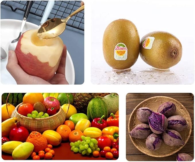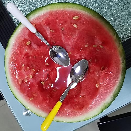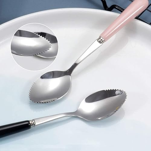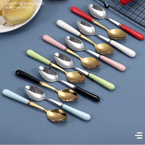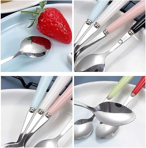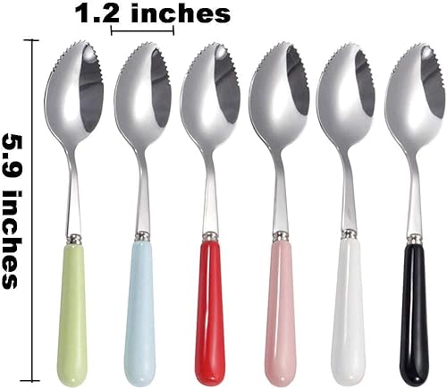 Lot de 6 cuillères à pamplemousse avec bords dentelés ronds, cuillère dentelée en acier inoxydable avec poignée en céramique multicolore, kiwi, pomme, agrumes, cuillères à dessert