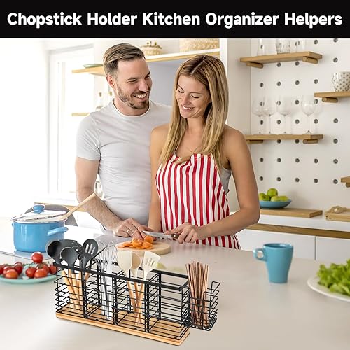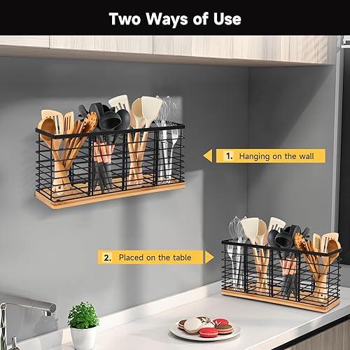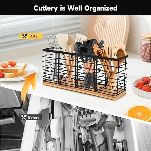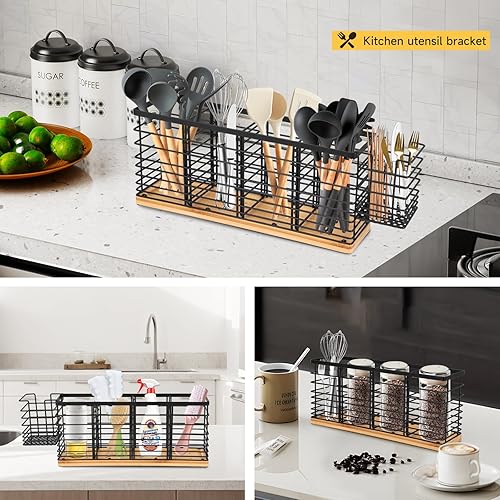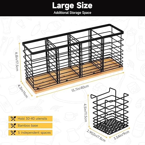 Porte-ustensiles de cuisine en acier inoxydable avec 4 + 1 compartiments en bois - Récipient pour ustensiles de cuisine avec plateau amovible - Grand bol pour couteaux, cuillères et accessoires de
