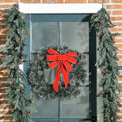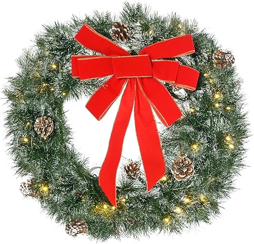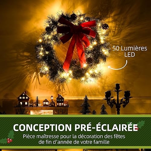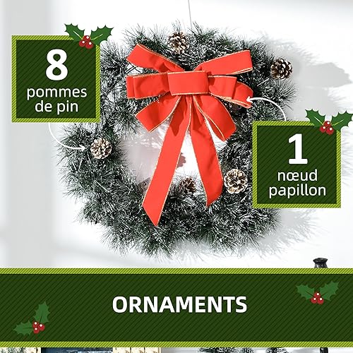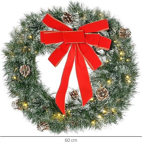 HOMCOM Couronne de Noël 60 cm, 50 LED pour Porte d'entrée, guilande de Noël, Sapin de Noël, 8 Pommes de pin et 1 nœud Papillon, décoration de fête, Vert