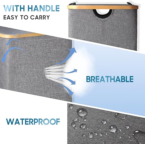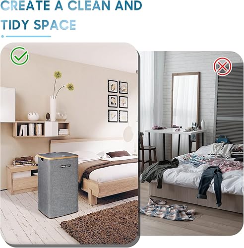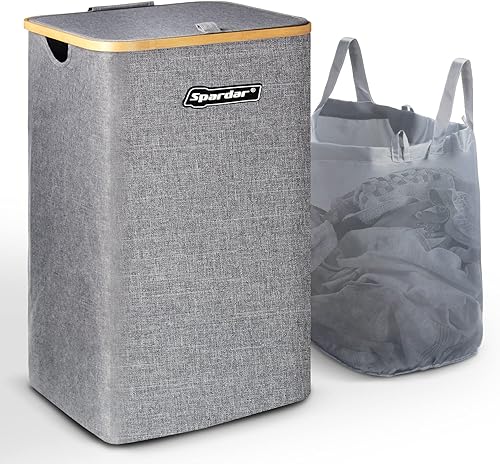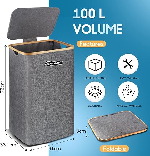 Spardar Paniere a Linge Sale, 100L Grand Panier a Linge Pliable avec Couvercle et Anses en Bambou, Bac a Linge Sale pour Chambre, Panier Linge avec Sac Intérieur