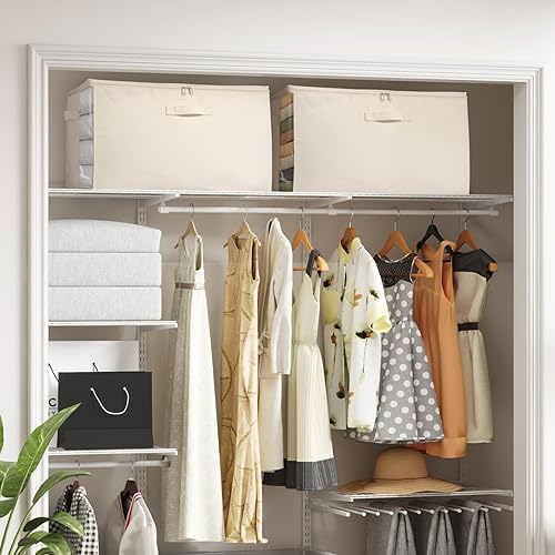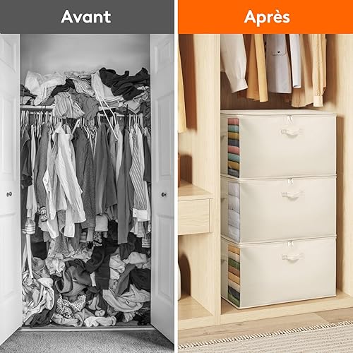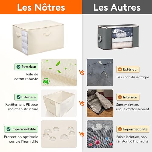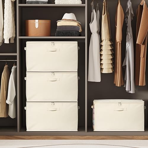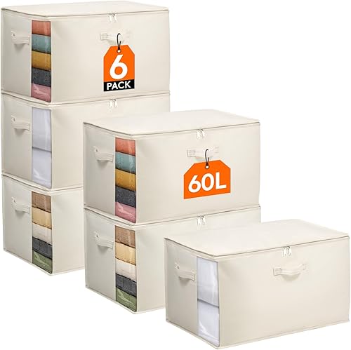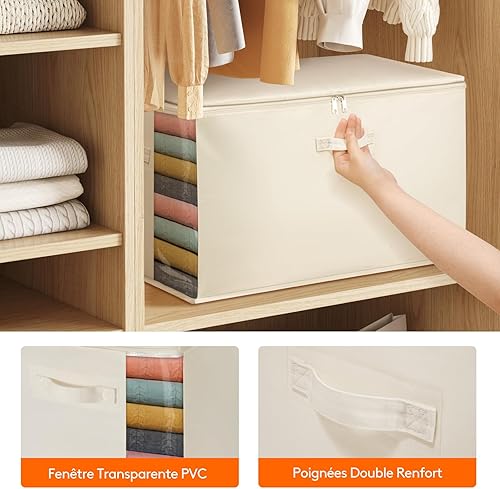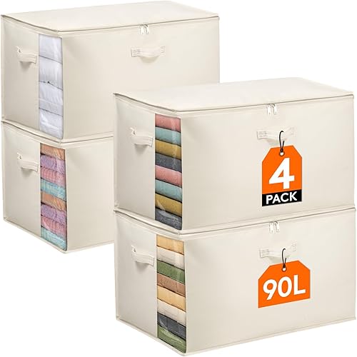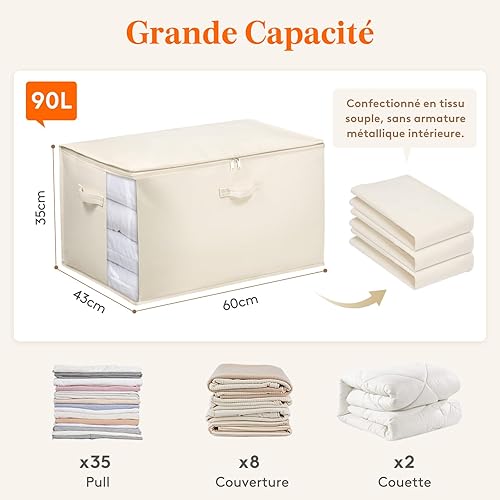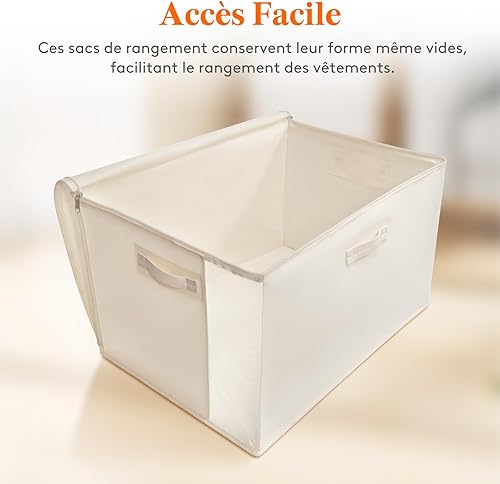 Lifewit Lot de 4 Sacs de Rangement avec poignées - 60 l - avec Couvercle - avec poignée renforcée - pour couettes, penderies - Beige