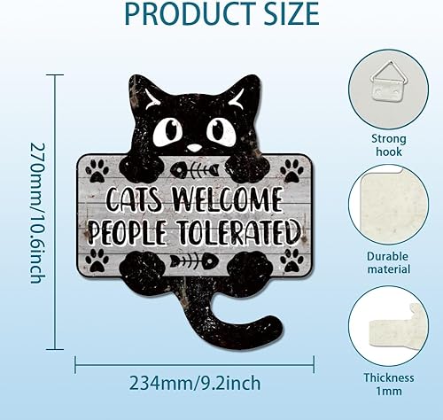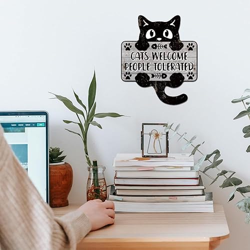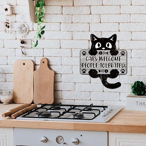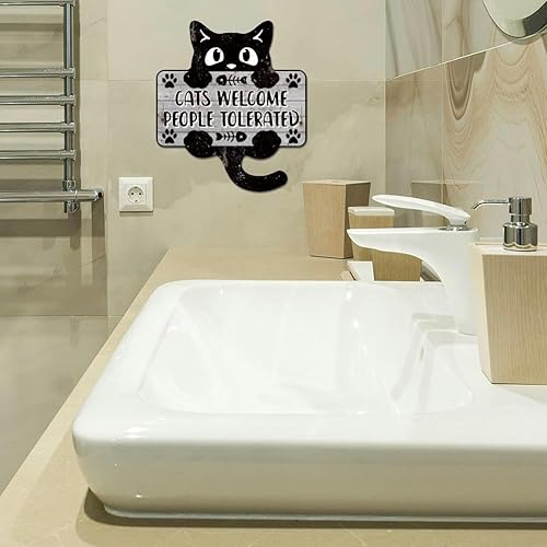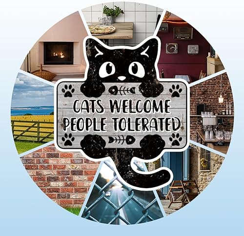 GLOBLELAND Plaque en Métal avec Motif 'Cats Welcome People Tolerated' Chat Noir Décoration Murale Vintage Amusante pour Salon Chambre Café Cuisine Restaurant animal de compagnie