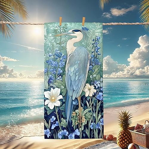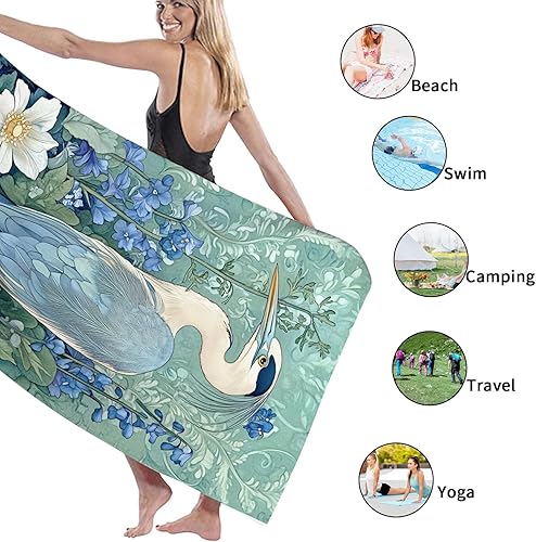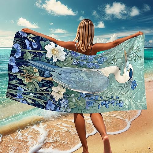Vintage Heron Serviette de plage en microfibre à séchage rapide, absorbante, douce, anti-sable, légère, pour vacances, pique-nique, camping, piscine, salle de sport, 177,8 x 88,9 cm