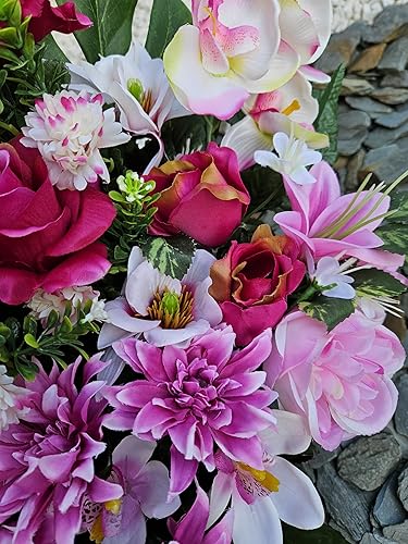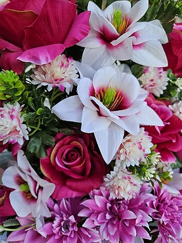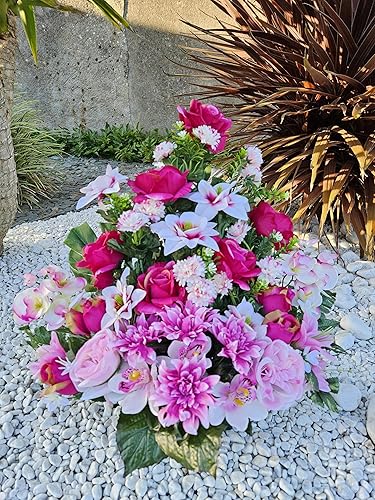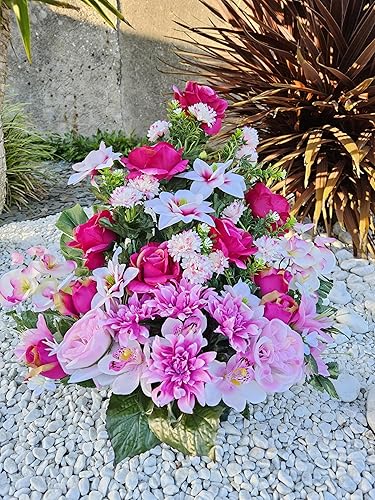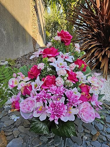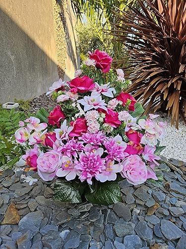 Composition de Fleurs Artificielles Lesté Ciment, pour Une Parfaite Tenue à L' extérieur. Réalisé par Nos Soins, Fleurs De Qualité.