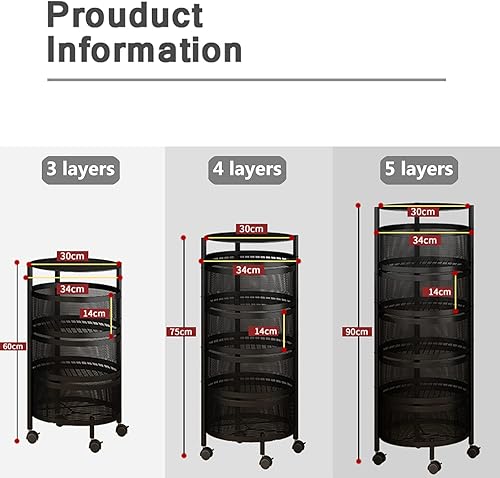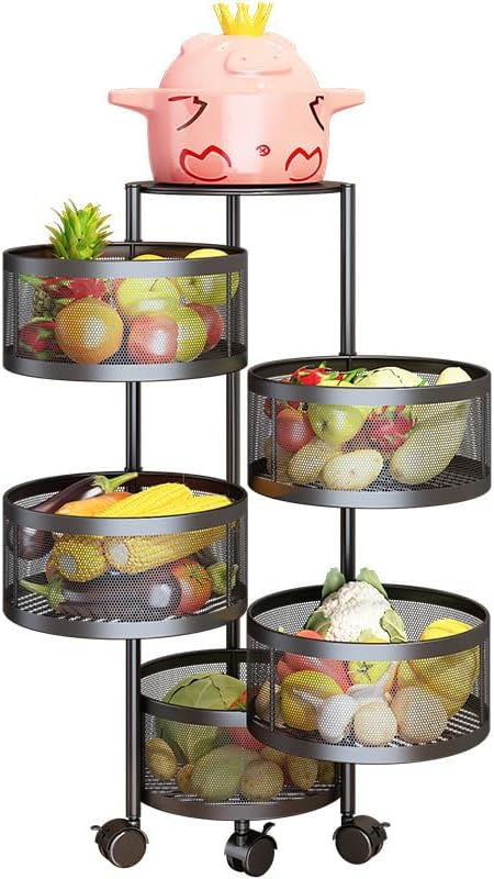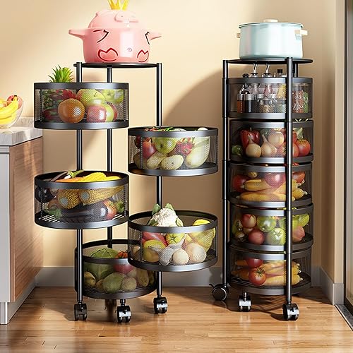 PEALOV Panier De Fruits Et Legumes Rotatif,Support De Rangement Rond De Cuisine, Support De Stockage De Fruits Rotatif, Chariot De Rangement Pour Cuisine Avec 4 Roues,éTagèRe à Fruits Debout