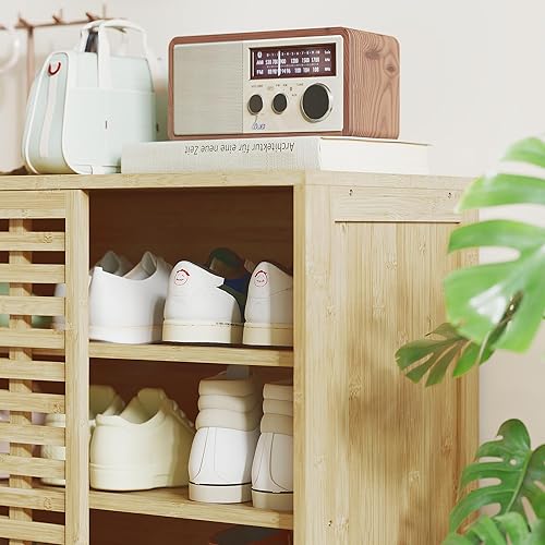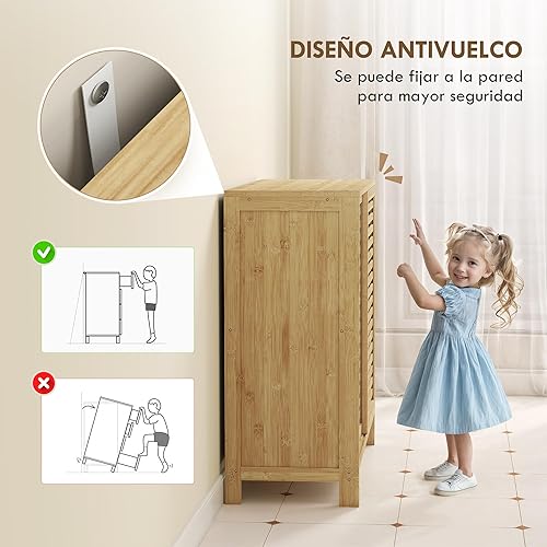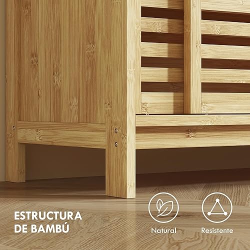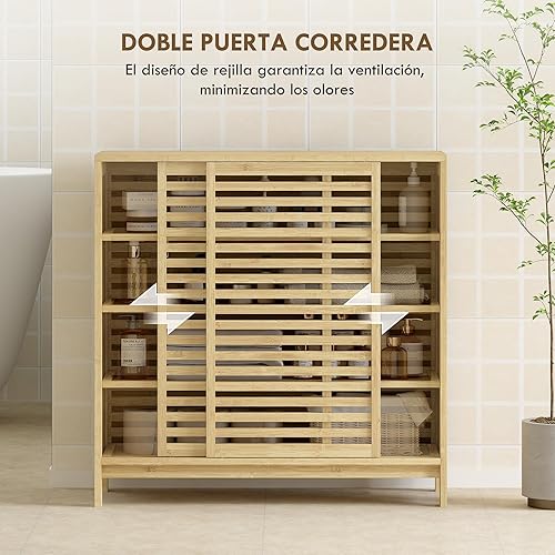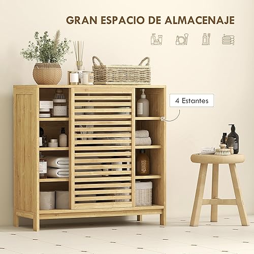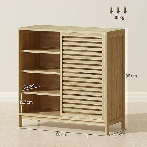 HOMCOM Armoire de salle de bain en bambou avec 2 portes coulissantes Design à lattes 4 étagères Meuble auxiliaire de rangement pour cuisine salon 80 x 34 x 80 cm Naturel