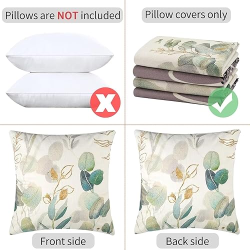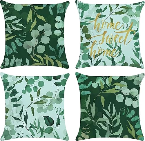 Lot de 4 Housse de Coussin d'extérieur 45x45cm, imperméable Décoratif Housses Coussin Feuilles d'eucalyptus vert Lin Taie Oreiller de Canapé pour De pour Patio Jardin Salon Chambre Décoration I-23
