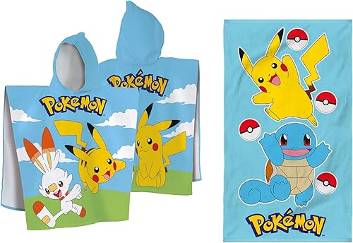 Pokemon Grass ET Port Ensemble Cape de Bain et Drap de Plage | 100% Coton | Oeko-TEX | 60x120cm + 70x120cm | Imprimé Garçon | Bleu