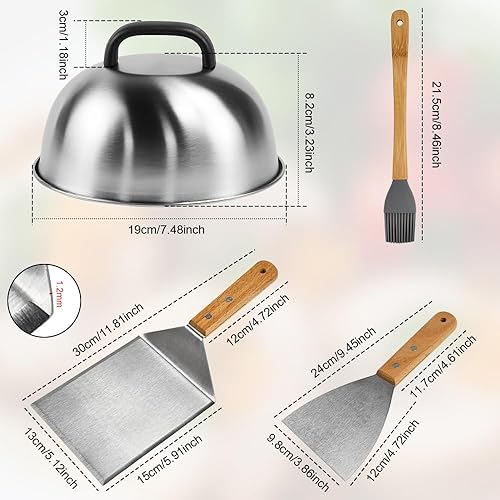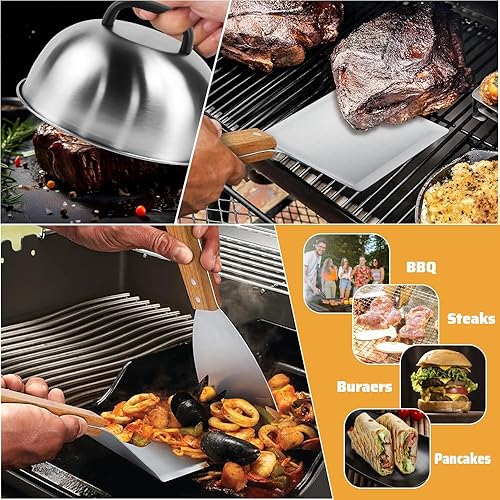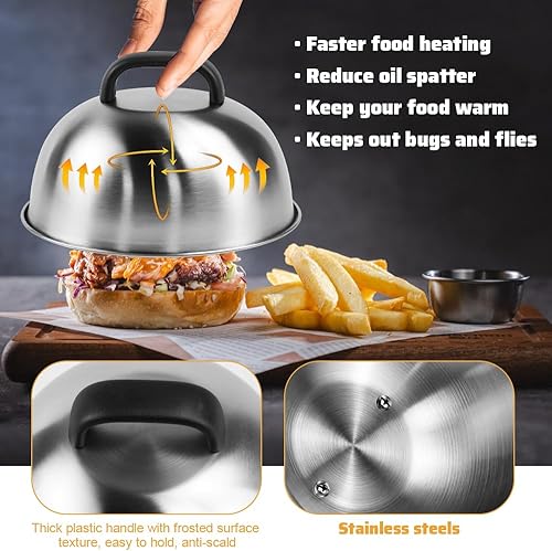 HWSWSH 19cm Cloche Plancha en Acier Inoxydable avec Spatule à Steak 30*13cm et Spatule Cuisine 24*10cm Brosse Silicone, Cloche à Burger Cloche à Chaleur pour Steak, Hamburger, Fromage, Oeufs, Crêpes
