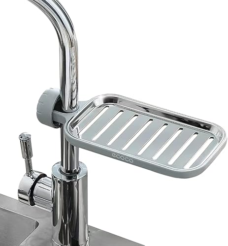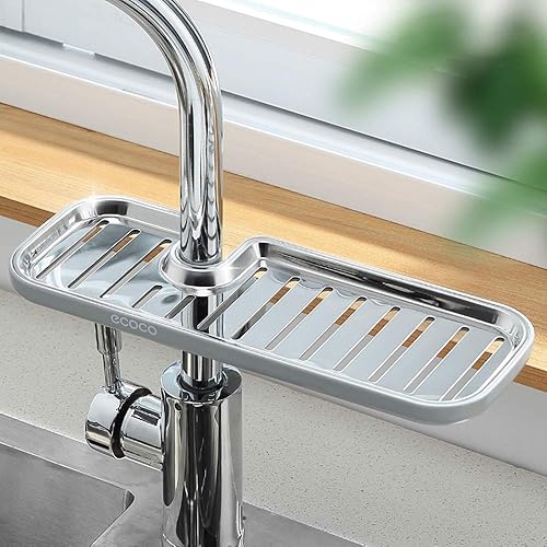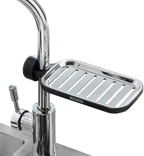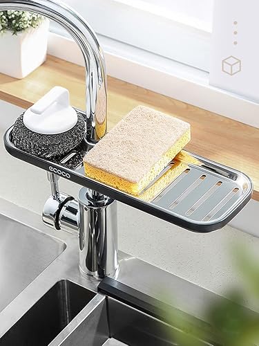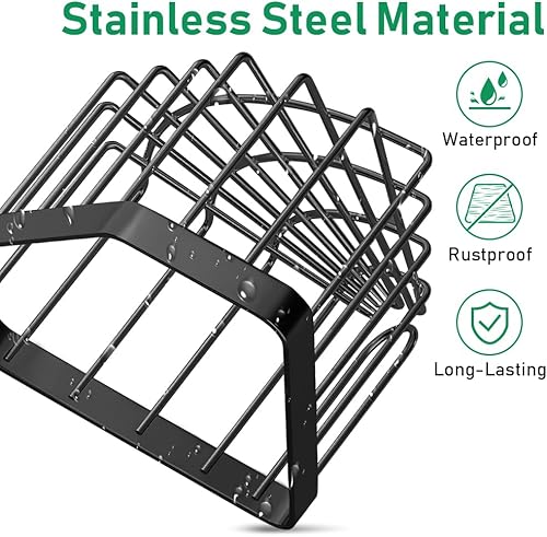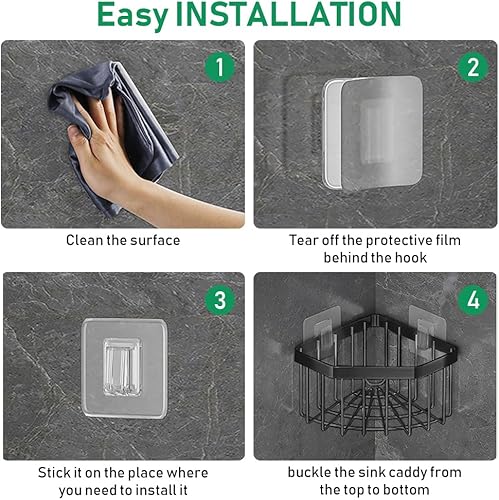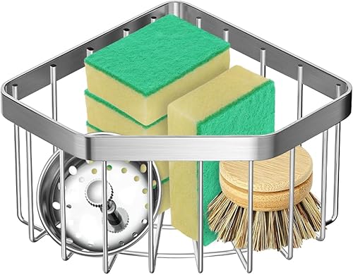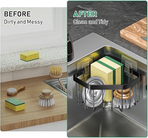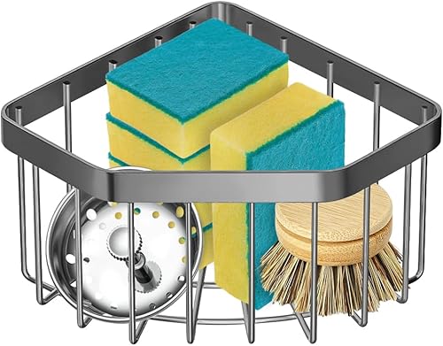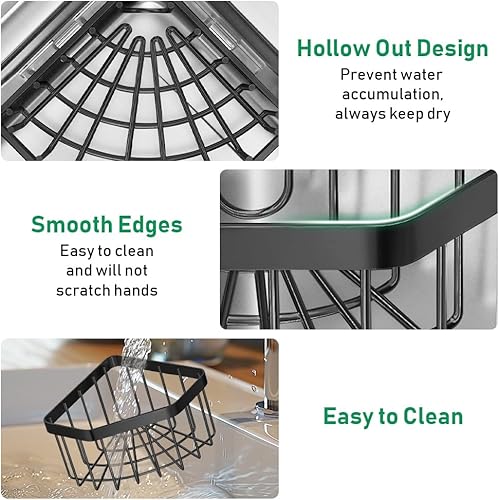 TOKPLNU Organiseur d'évier de cuisine triangulaire en acier inoxydable avec crochet adhésif, panier à ustensiles de vaisselle, porte-éponge auto-drainant pour éponges, brosses, savon, noir