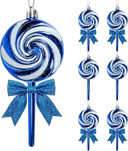 Lot de 6 décorations de Noël en forme de bonbons à suspendre avec nœuds à paillettes pour sapin de Noël, couronnes et décorations de vacances (bleu glacier)