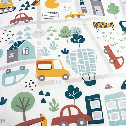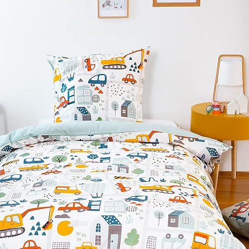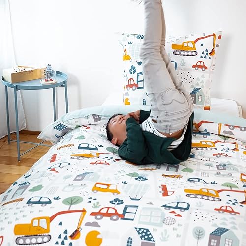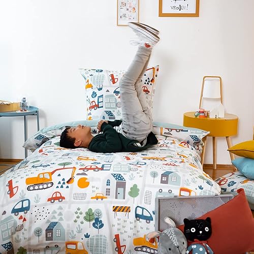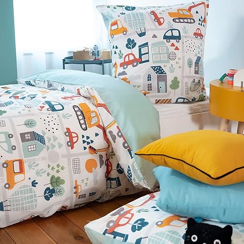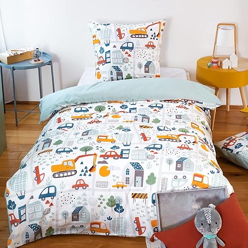 CÔTE DECO Parure de lit Enfant Réversible en Route Bleu Housse de Couette 140x200cm + 1 taie d'oreiller 63x63cm Twin