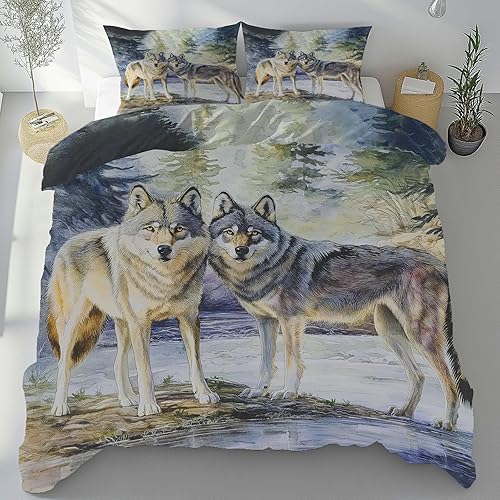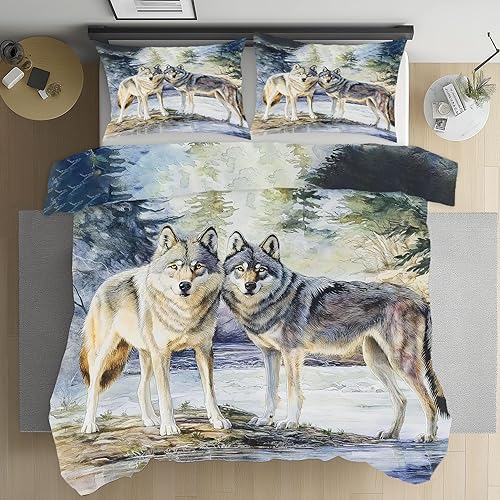 Housse de Couette 140x200 Motif Loup Aquarelle Douce et Respirante, Animaux Sauvages Forêt Jungle Parure de Lit avec Fermeture Éclair, 2 Taies d'oreiller 65x65cm