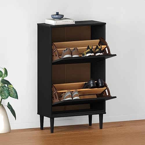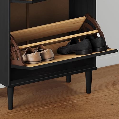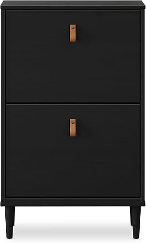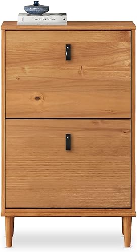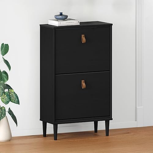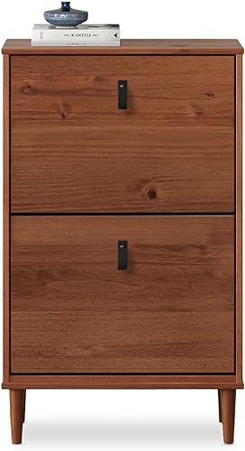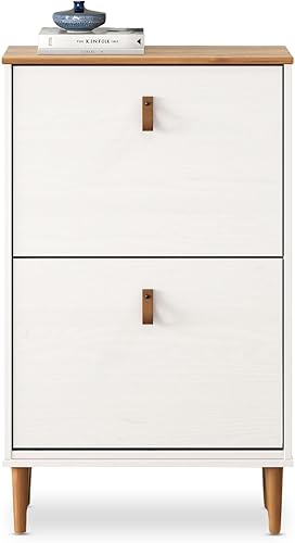 IDIMEX Meuble à Chaussures entrée Mikka 2 abattants en Bois Massif Coloris châtaignier pour jusqu'à 10 Paires 59 x 96 x 25 cm idéal pour Le Couloir Rangement Peu encombrant étagère poignées en Cuir