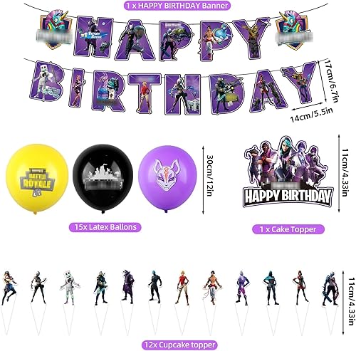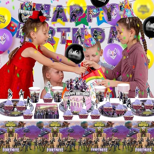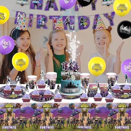 92PCS Ensemble Vaisselle Fête Kit Fortnit-e, Decoration Anniversaire avec Assiette Nappe Ballon Bannière d'Anniversaire, Kit de Fête Anniversaire pour 10 Invités