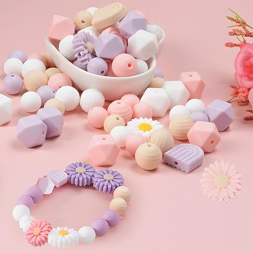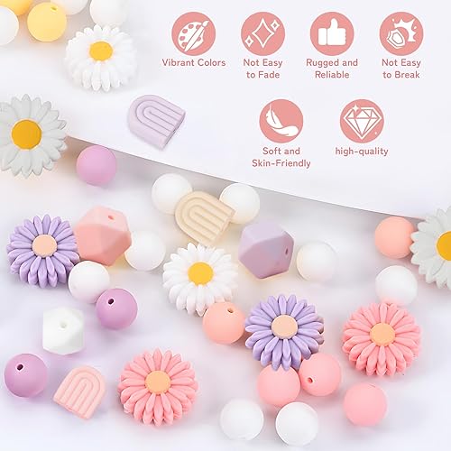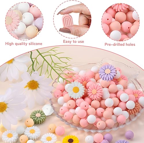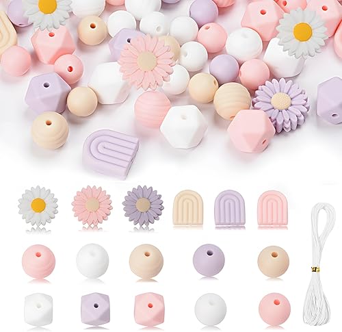 Perles en silicone en vrac - En forme de fleur - Rondes - Perles en silicone - Avec corde en nylon - Pour bricolage, porte-clés, bracelets, colliers - Fabrication de bijoux