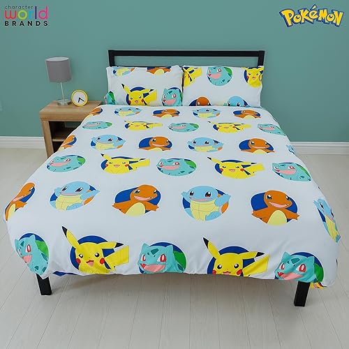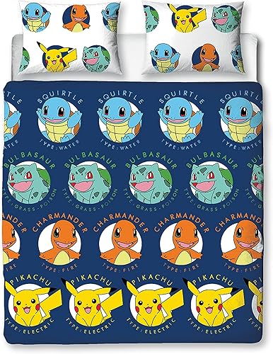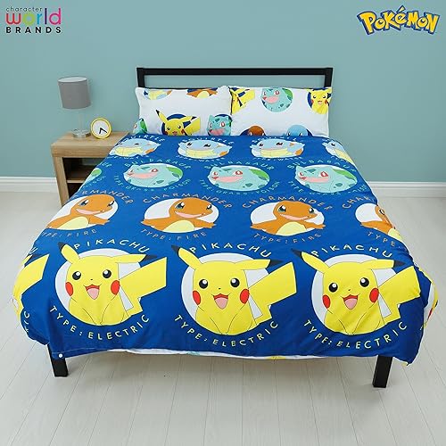 Character World Pokémon Parure de lit Double Officielle Gotta Design | Bleu réversible Pikachu Squirtle Charmander Housse de Couette 2 côtés Produit Officiel avec taies d'oreiller Assorties