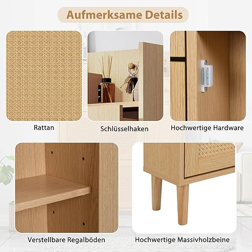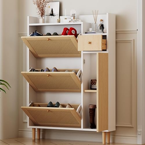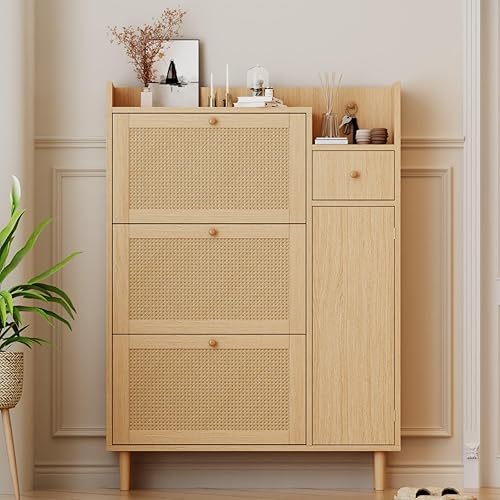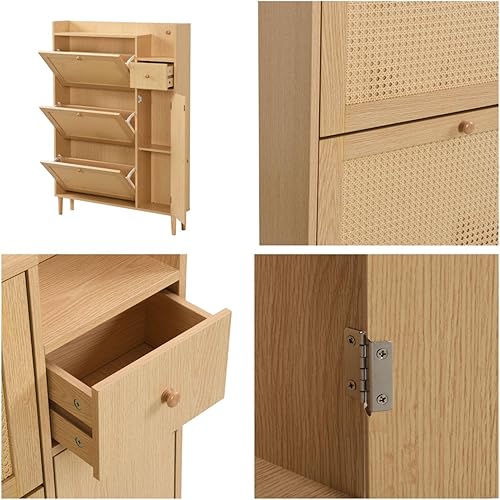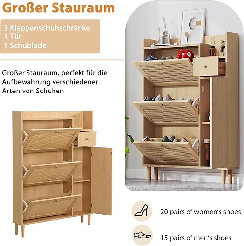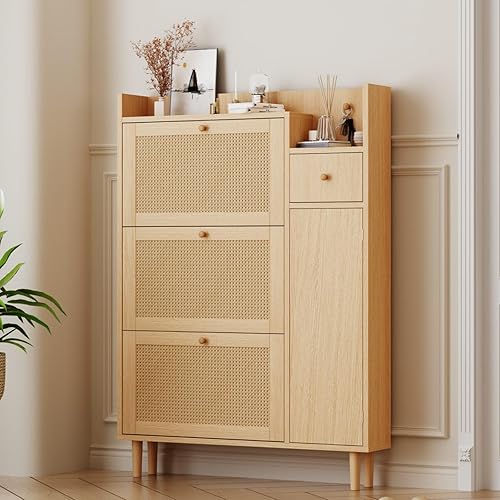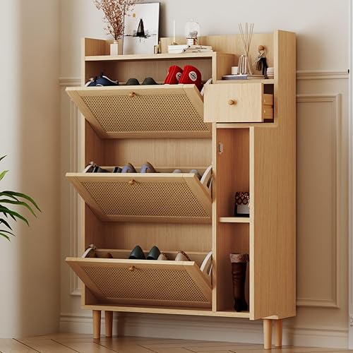 KOMHTOM Armoire à Chaussures en rotin avec 4 Portes et 1 Petit tiroir, Meuble a Chaussures Entree Range Chaussures (B, Couleur du Bois)