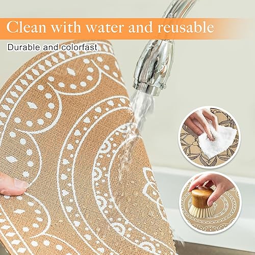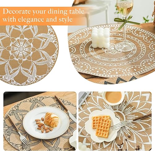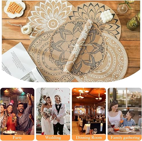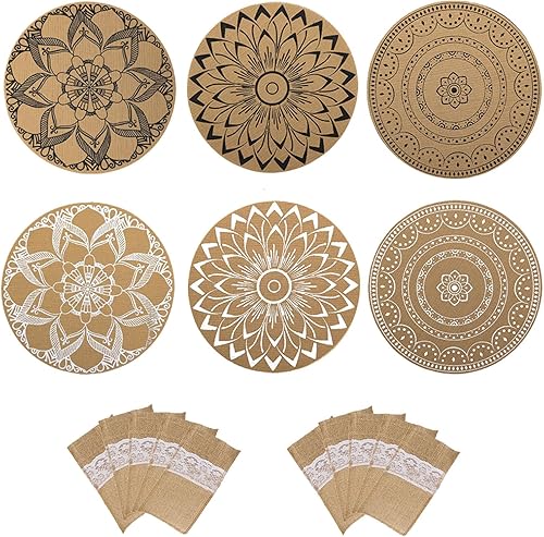 NIYATA 6Pcs Set de Table Rond Imitation Lin, Set de Table Rond en PVC Lin,Résistants à la Chaleur et Lavables,avec 10 Porte Couverts Jute et Dentelle Rectangle,pour Décorations de Table