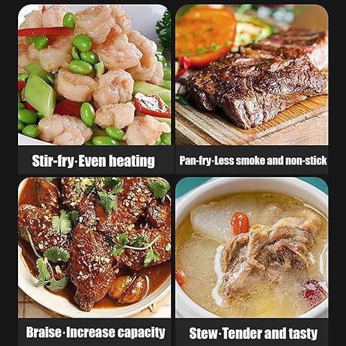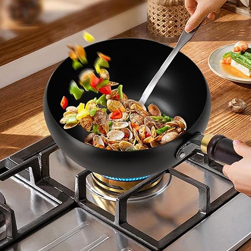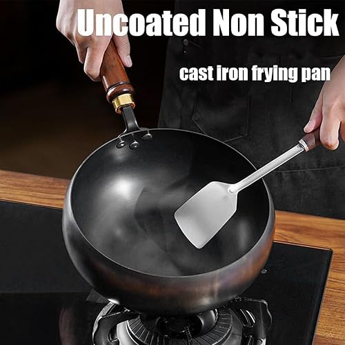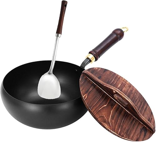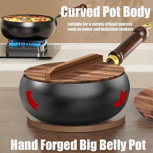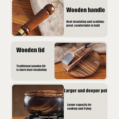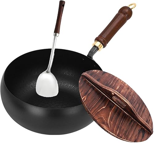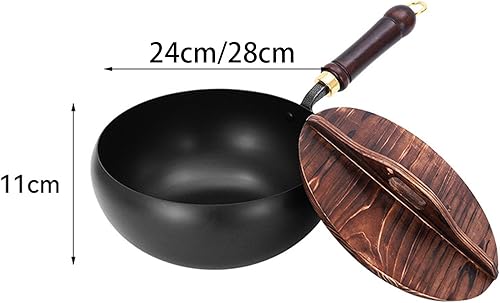 Générique Poêle japonaise en fer forgé de 24 cm avec couvercle en bois, poêle sans revêtement à fond rond, compatible avec gaz et induction, idéale pour saisir, mijoter ou pour le camping (B)