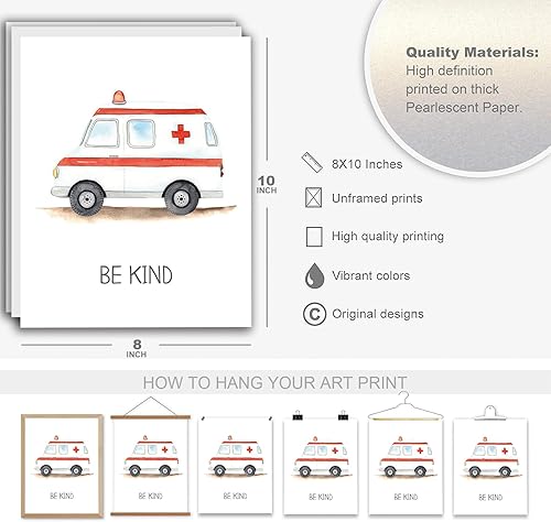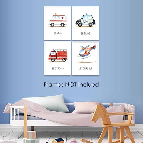 Lot de 4 impressions d'art mural pour chambre d'enfant, chambre de garçon, sans cadre, camion de pompiers, ambulance, voiture de police, transport de voiture, œuvre d'art pour chambre à coucher,