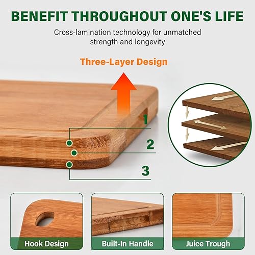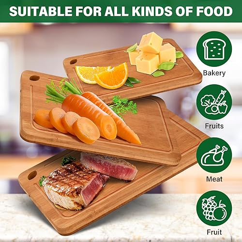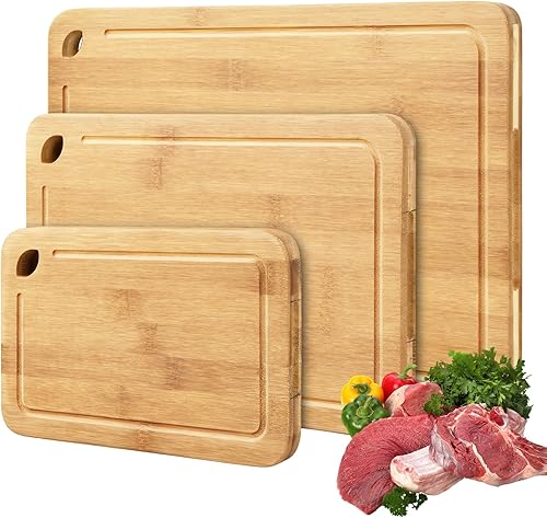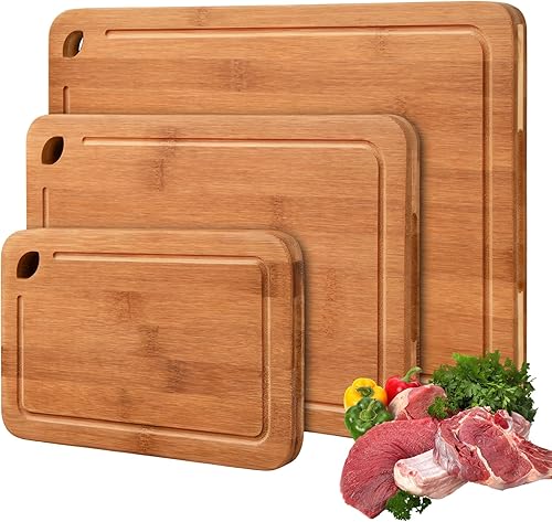 Lot de 3 Planche a Decouper Bois Planche à Découper en Bambou Naturel Planches à Découper d’Épaisseur Cutting Board Renforcé Professionnelle pour Cuisine,Pain,Viande,Fruits Grand/Moyen/Petit (Naturel)