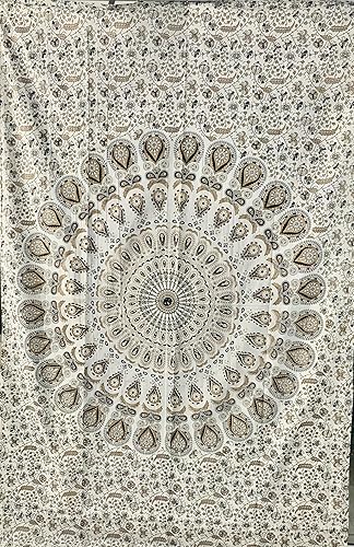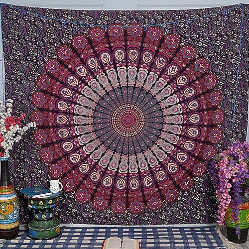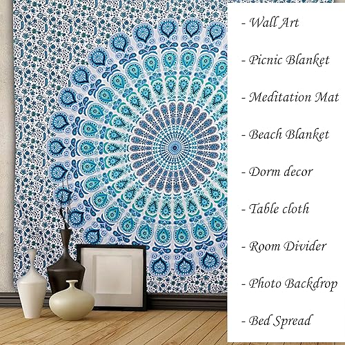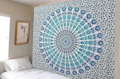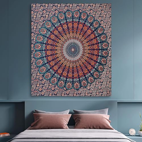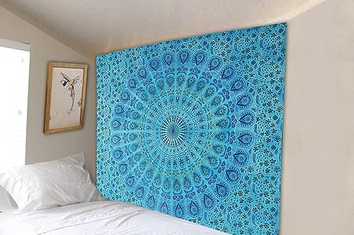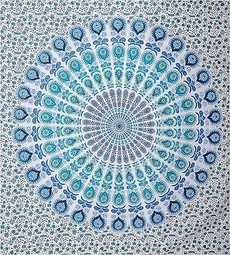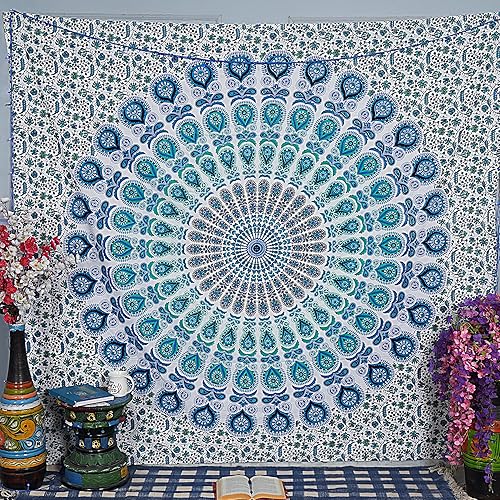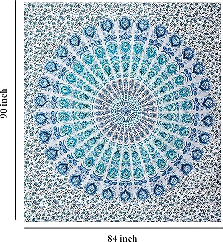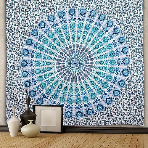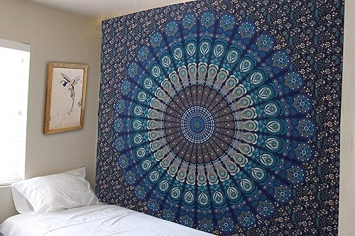 FURNISHFUL FINESSE Tapisserie mandala paon pour chambre à coucher, style indien, bohème, tentures murales, hippie, psychédélique, décoration de chambre, couvre-lit, tapis de yoga, 76 x 102 cm, bleu