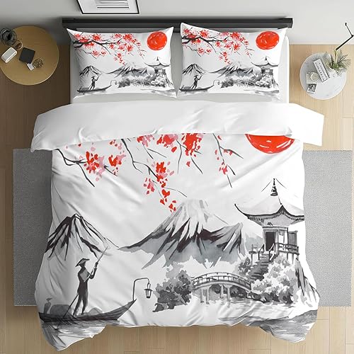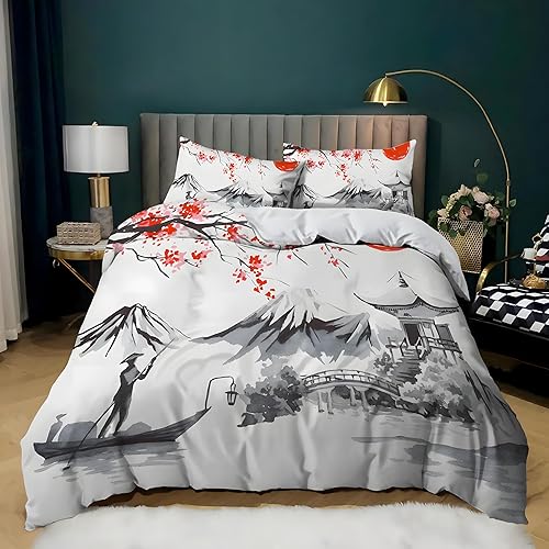 Parure de Lit 160x200 Japonais Imprimé Housse de Couette avec 2 Taies d'oreiller 65x65, Fleurs 1 Personne Ensemble de literie pour Filles Garçons Ado Décoration Chambre LC-599