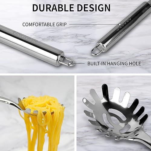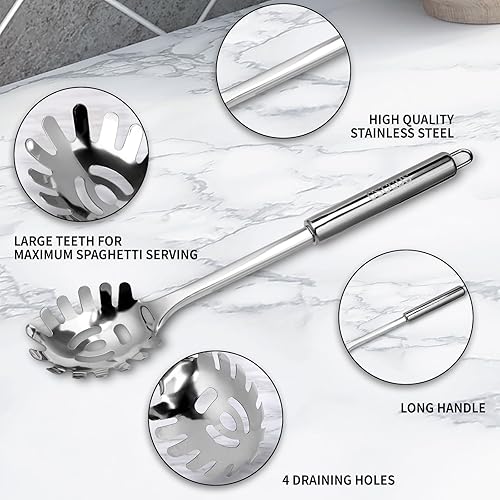 Cuillère à spaghetti, cuillère à pâtes monobloc en acier inoxydable, 30,5 cm, avec poignée ergonomique, passoire à pâtes avec dents, ustensile de serveur à pâtes argentées, passe au lave-vaisselle,