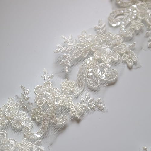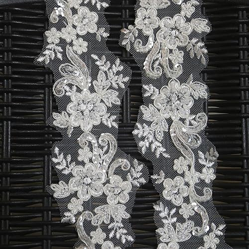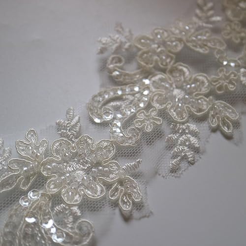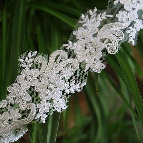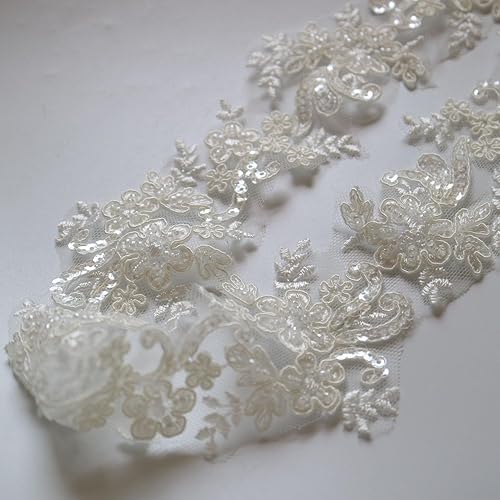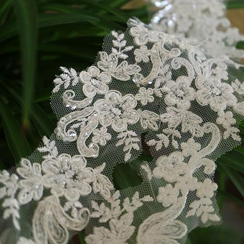 G-RUI Appliques de luxe en dentelle perlée pour robes de mariée avec strass - 2 m (blanc cassé)
