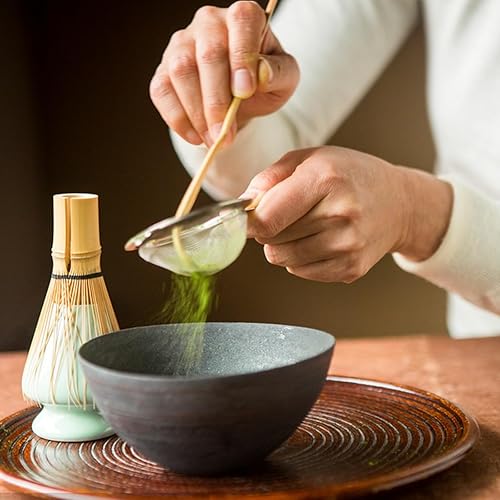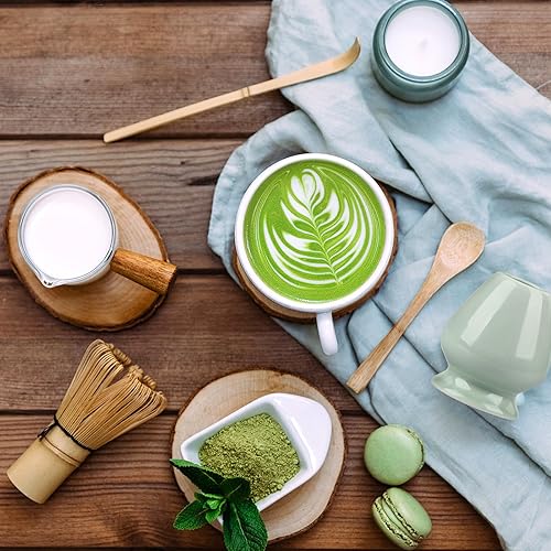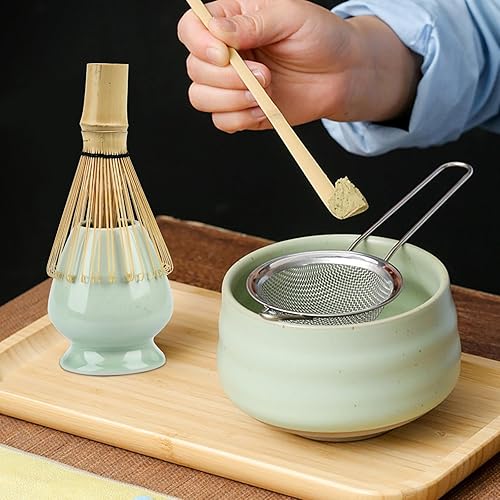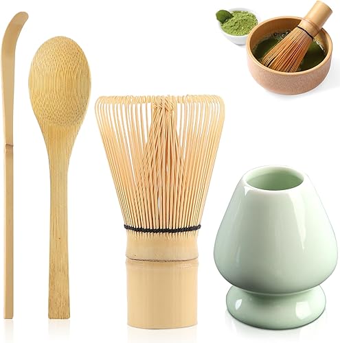BLUESEABUY Matcha Set 4 Pièces Accessoire de Cérémonie du Matcha Cuillère Traditionnelle Fouet Chasen Cuillère à Thé Porte-Fouet en Céramique pour Préparer une Tasse de Thé Matcha