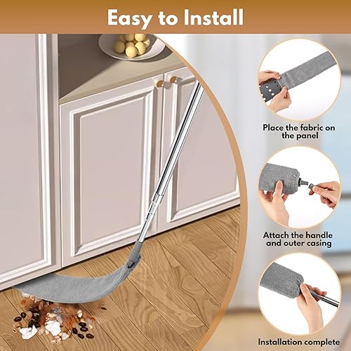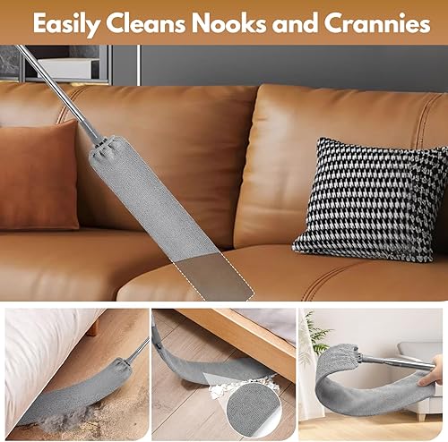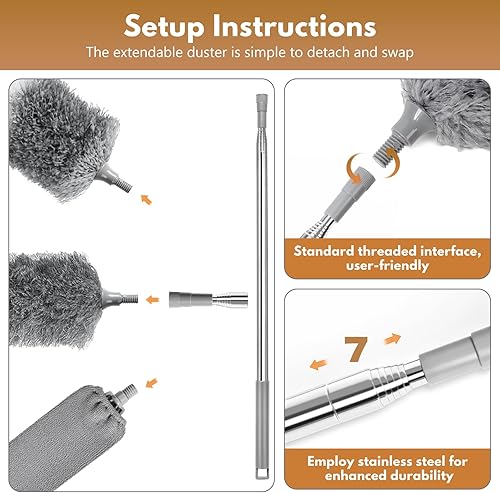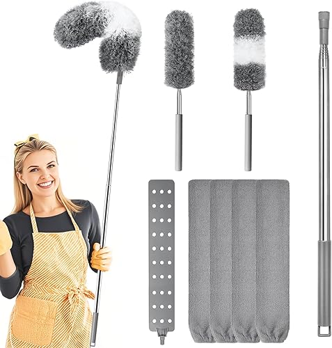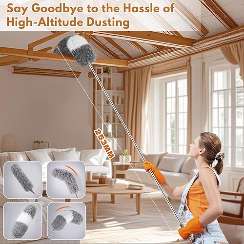 Wusboo Plumeau Poussière 8 Pièces Lavable, 2 Tête de Loup Télescopique Duster Telescópico avec Manche 253 cm, Nettoyeur Rétractable pour Fentes avec 4 Chiffons Remplaçables pour Plafonds et Fissures