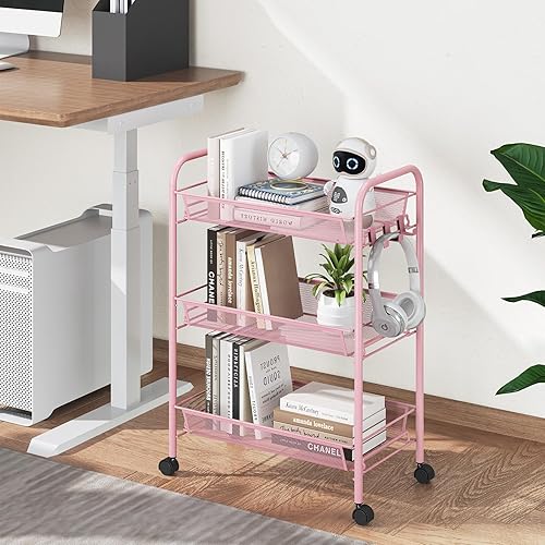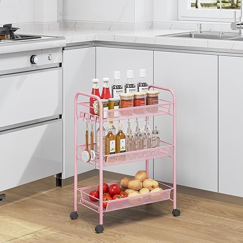APEXCHASER Chariot de Cuisine, 3 Niveaux étroit, Chariot de Service, Chariot de Cuisine sur roulettes, étagère de Niche, étagère de Cuisine, Chariot Utilitaire avec Grande capacité pour Cuisine, Rose