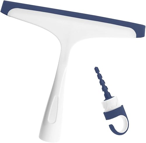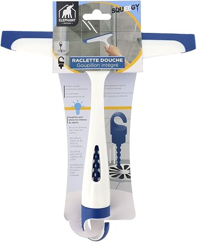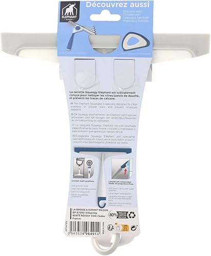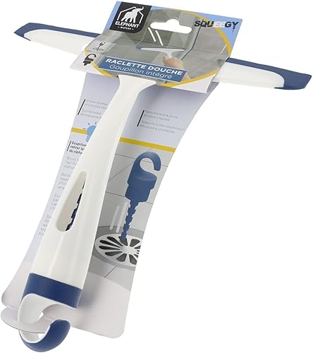 ÉLÉPHANT MAISON - Raclette Douche Squeegy - pour Les Parois De Douche - Goupillon en Élastomère - Prévient L'Apparition du Calcaire - Goupillon Intégré - Blanc & Bleu - Fabriqué en France