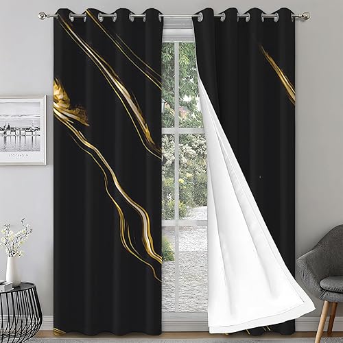 Rideau Salon Occultant -Isolant Thermique Rideaux À Oeillets Décoration De Fenêtre Pour Chambre Enfant, 3D Motif De Lignes Fluides Noires Et Dorées Motif 280X260Cm 2 Panneau Rideaux Et Draperies In