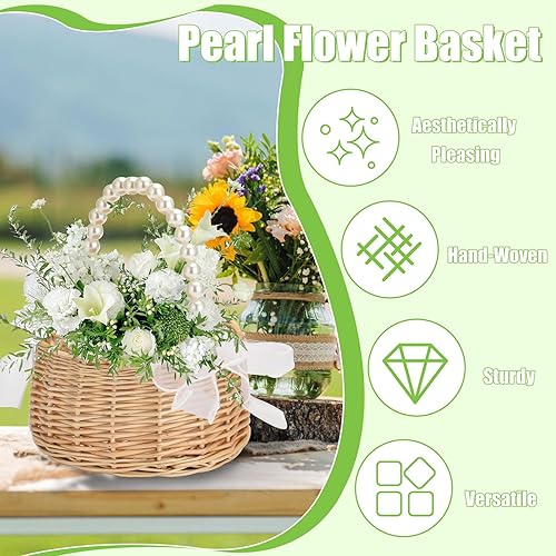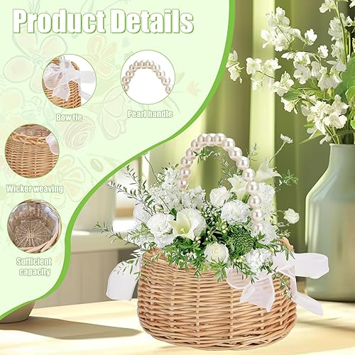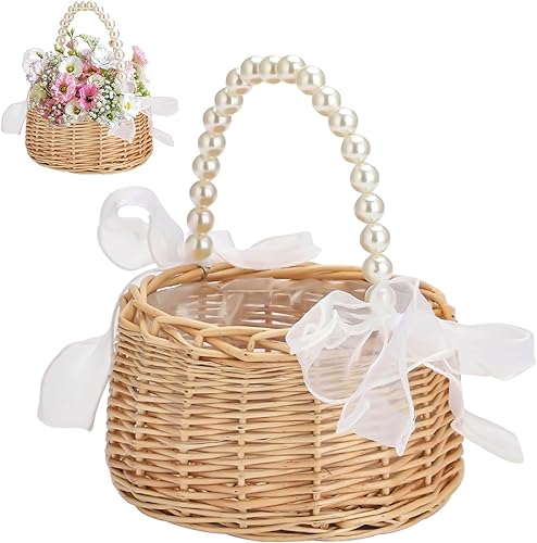 Sctmda Panier de Fleurs en Rotin Osier Panier à Fleur Tressé en Rotin Panier en Osier Tressé Panier à Fleur Fait à Main Panier Rotin en Osier Fleur de Mariage Panier en Osier avec Poignées et Ruban