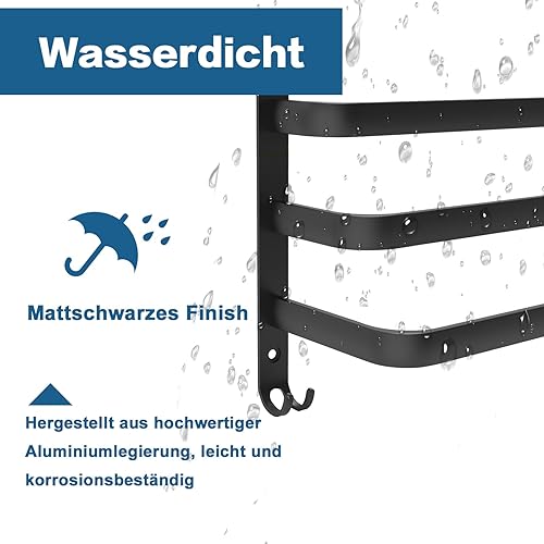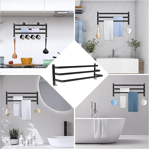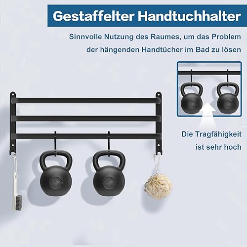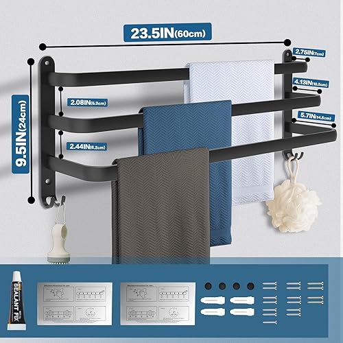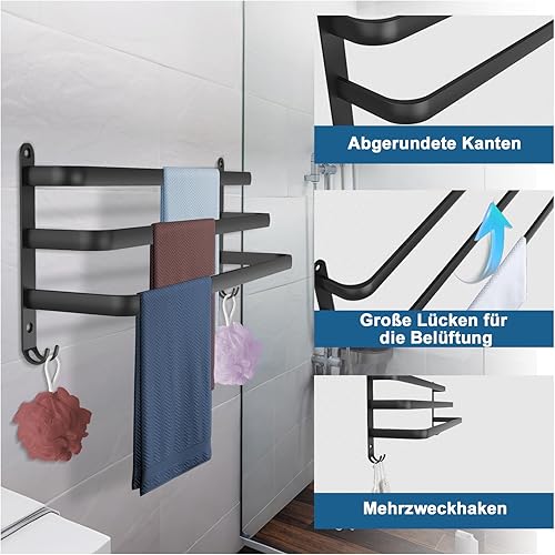 Porte-serviettes mural à 3 étages en aluminium - 60 cm - Sans perçage - Avec crochets - Pour salle de bain, cuisine, salle de bain - Noir