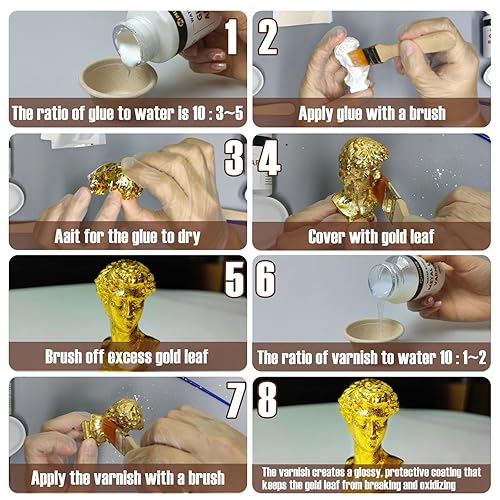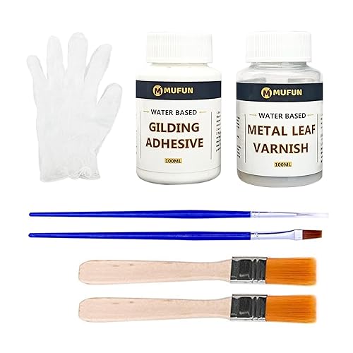 Décoration de feuille d'or 200 ml, ensemble de dorure adhésive en feuille d'or pour les arts et l'artisanat – adhésif pour dorure 100 ml, peinture en feuille métallique 100 ml, 4 pinceaux, 2 gants