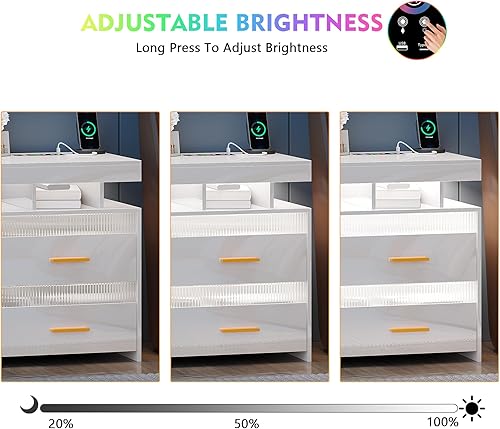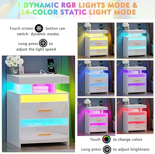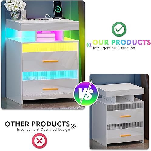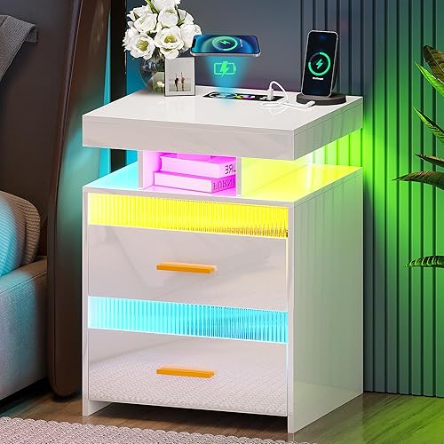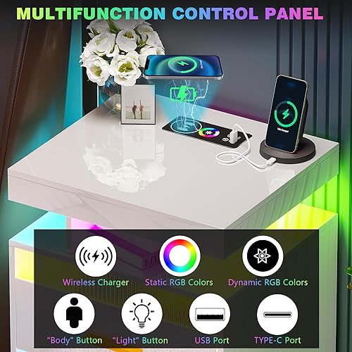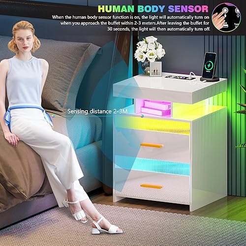 Lvifur Table de Nuit LED, avec tiroir caché, Table de Chevet de Chargement avec Port USB et Type-C, lumière à capteur Humain,Compartiment Ouvert et 2 tiroirs Blanc