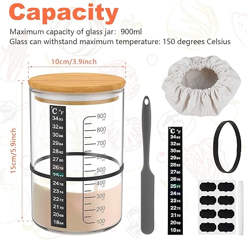 HuhWafee Kit de démarrage pour levain 900 ml, verre au levain avec couvercle en bois, spatule en silicone, papier thermomètre, chiffon de fermentation, kit de démarrage réutilisable pour la