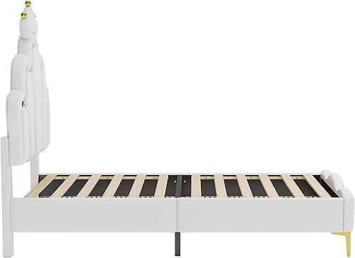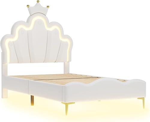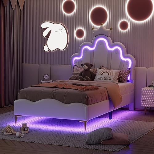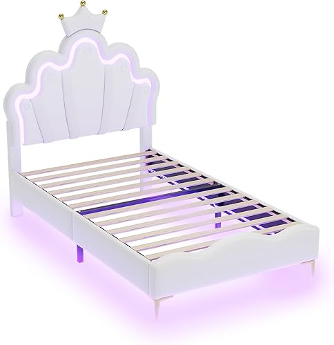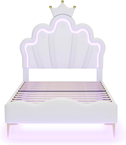Zepneiy Lit Enfant avec LED, Lit rembourré 90X200 avec lit Princesse en Forme Couronne, Lit Simple avec sommier à Lattes et Dossier Cadre de, Fabriqué PU Rose (sans Matelas)