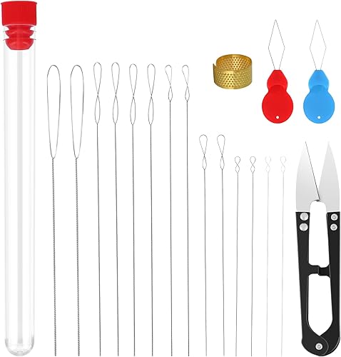 Lot de 14 aiguilles à perles pour enfiler des perles, avec bouteille d'aiguille, dé à coudre, ciseaux, enfile-aiguille, aiguilles en acier inoxydable pour enfiler des perles, aiguilles à perles extra